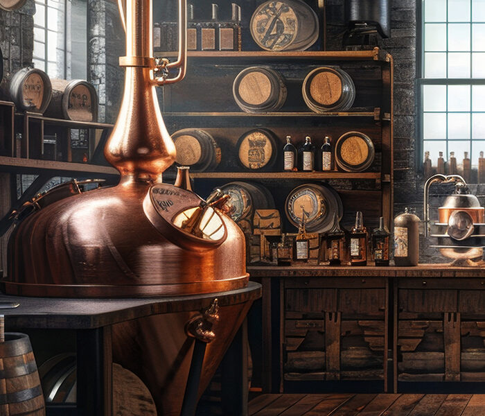 Crafting Artisanal Spirits Rustic Distillery Scene with Blank Business Cards Copper Stills and Oak Barrels